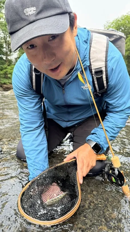 撮影日はカメラマンに徹していたまっちゃんも渓流初挑戦ですぐにヤマメ・イワナを釣って魚の綺麗さと、この景色の中で釣りをする快感に感動していました。