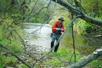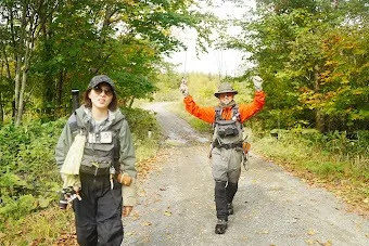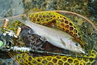 安全を考慮して、場所を変え、スタッフMINAが良型ニジマスをようやくキャッチ。