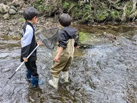 息子の同級生を連れて近所の川でニジマス釣り