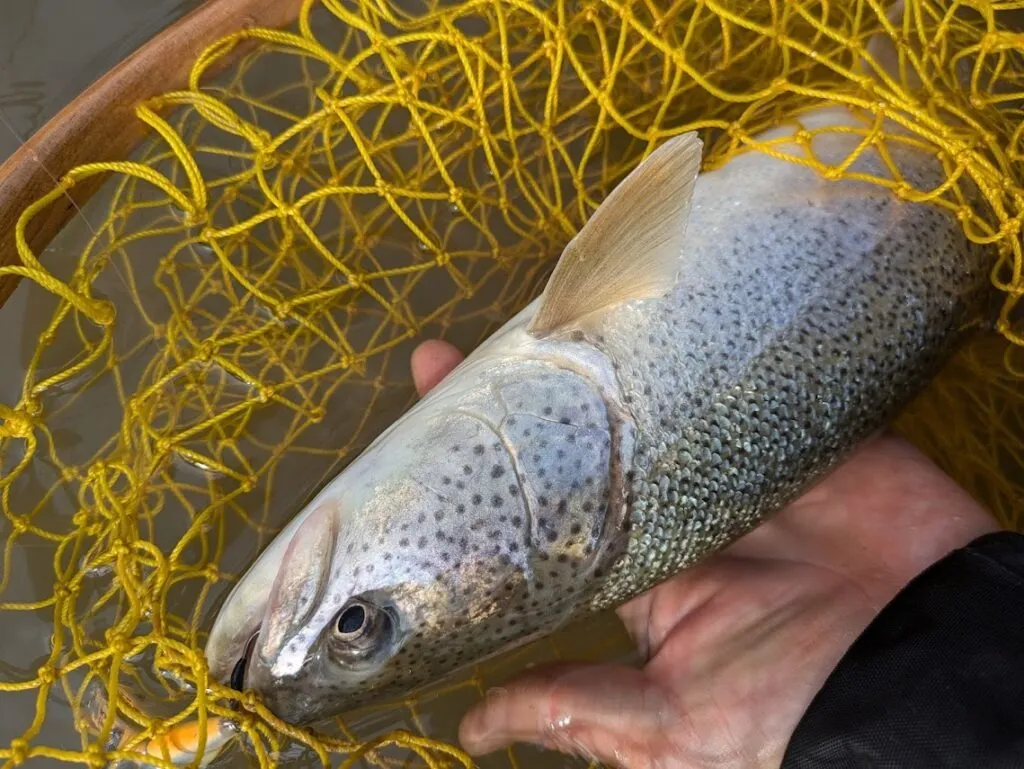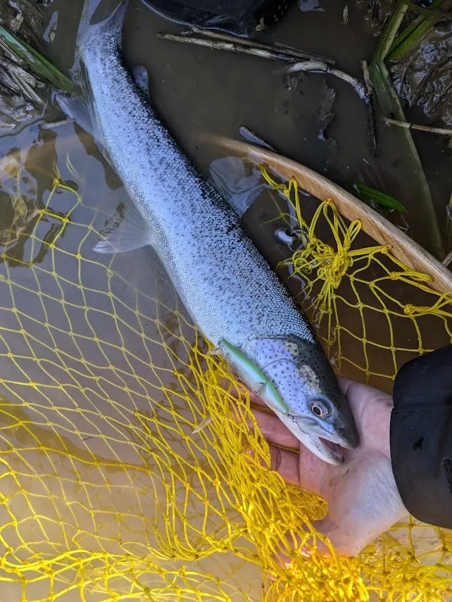 開始早々に、細身なイトウをゲット。